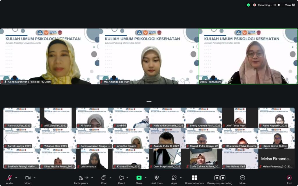 Jambi, 24 April 2025 – Jurusan Psikologi Fakultas Kedokteran dan Ilmu Kesehatan (FKIK) Universitas Jambi kembali menyelenggarakan kuliah umum bertajuk “Strategi Promosi Kesehatan Mental”, yang dilaksanakan secara daring melalui platform Zoom Meeting pada Kamis, 24 April 2025. Kegiatan ini merupakan bagian dari kerja sama akademik antara FKIK Universitas Jambi dan Fakultas Kedokteran Universitas Sriwijaya.