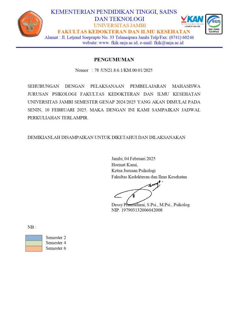 Jurusan Psikologi, Fakultas Kedokteran dan Ilmu Kesehatan, Universitas Jambi, resmi mengumumkan jadwal perkuliahan Semester Genap 2024/2025. Berdasarkan pengumuman yang dirilis, perkuliahan akan dimulai pada Senin, 10 Februari 2025.
