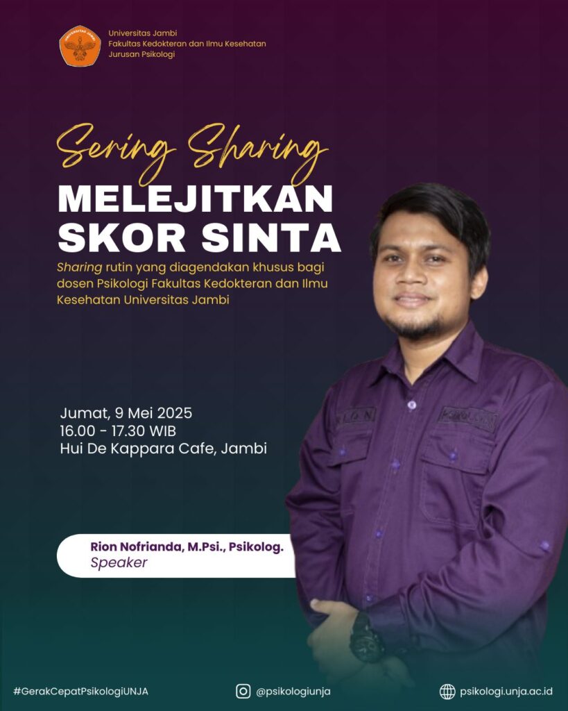 Jambi, 10 Mei 2025 – Program Studi S-1 Psikologi Fakultas Kedokteran dan Ilmu Kesehatan (FKIK) Universitas Jambi menggelar kegiatan bertajuk “Sering Sharing: Melejitkan Skor SINTA” pada Jumat sore (9/5) secara hybrid, bertempat di Huis De Kappara, Kota Jambi serta melalui platform Zoom Meeting. Kegiatan ini menjadi ruang strategis bagi para dosen untuk berdiskusi mengenai penguatan kualitas publikasi ilmiah sekaligus menjadi ajang silaturahmi bersama Koordinator Prodi S-1 Psikologi, Rion Nofrianda, S.Psi., M.Psi., Psikolog.